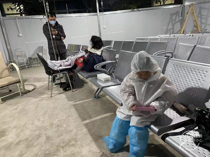 为了不让孩子犯困,吃了药之后,我们就在临时搭建的发热门诊等候区玩起了“躲猫猫”和“剪刀石头布”。