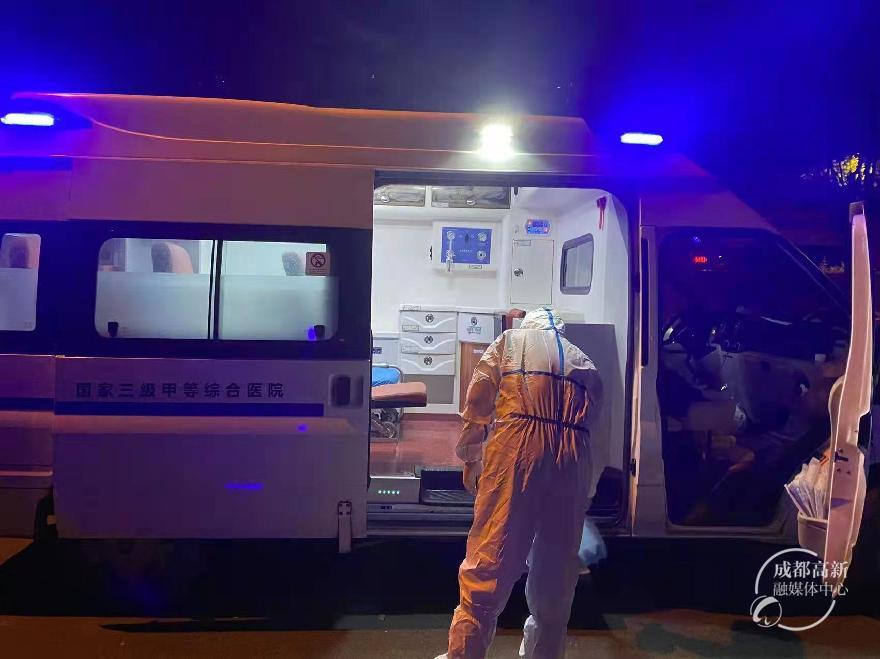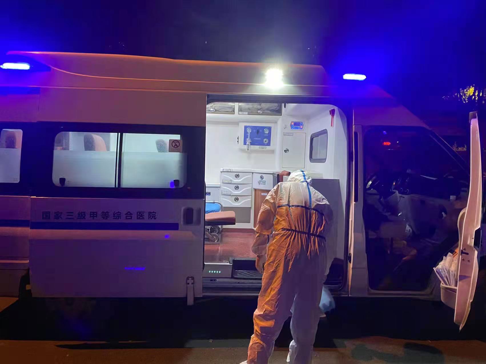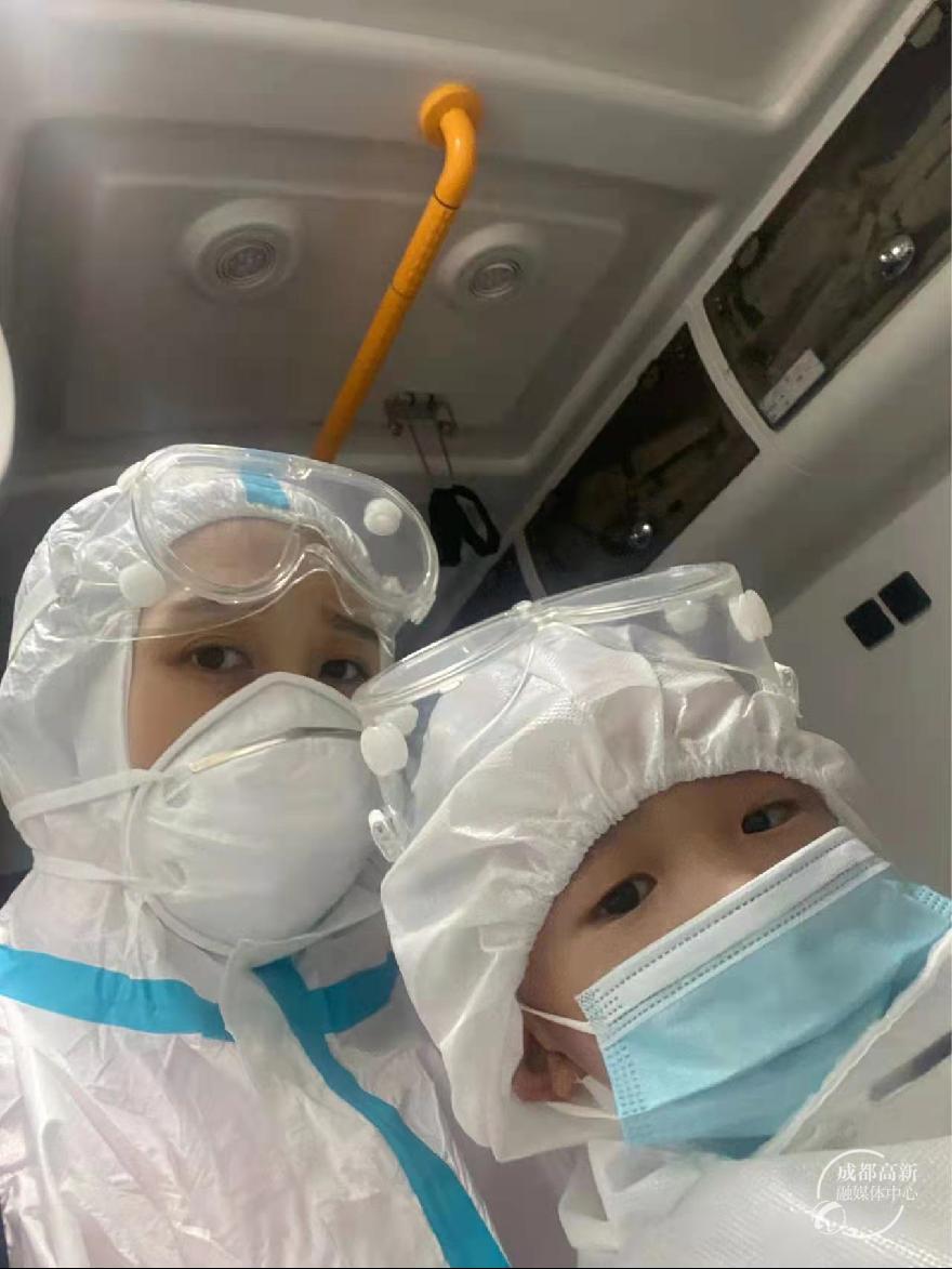 穿好防护服下电梯,一出门就有工作人员确认身份信息,然后引导我们出门上救护车。为了避免交叉感染,救护车每次只能拉一个家庭,接送完毕后马上消毒才能继续运行。