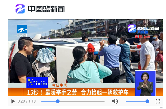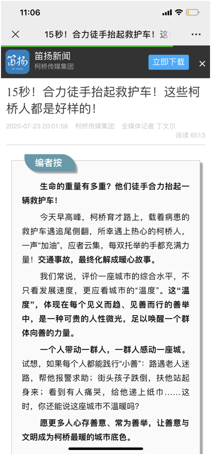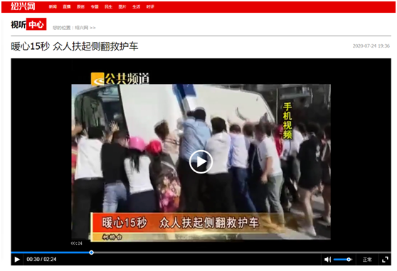 7月23日,柯桥传媒集团笛扬新闻app发布了“15秒!合力徒手抬起救护车!这些柯桥人都是好样的!”这一暖心事迹后,得到了社会各界的热烈点赞和转发。该新闻在中央电视台多时段多频道滚动播出,包括央视13套《新闻直播间》、《24小时》、央视2套《第一时间》等,光明日报客户端、浙江钱江频道、浙江新闻频道、浙江6频道、浙江教育科技频道等也先后播出。