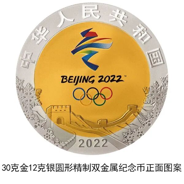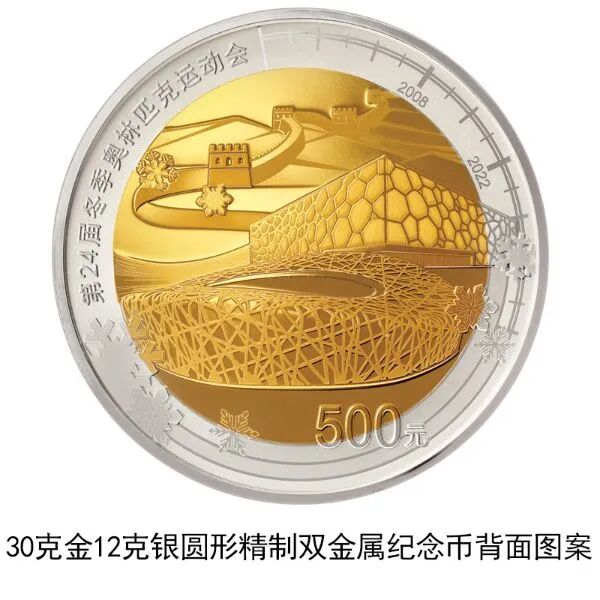 30克金12克银圆形双金属纪念币背面图案为国家体育场、国家游泳中心场馆造型,衬以长城、雪花等装饰组合设计,并刊“第24届冬季奥林匹克运动会”字样及面额。