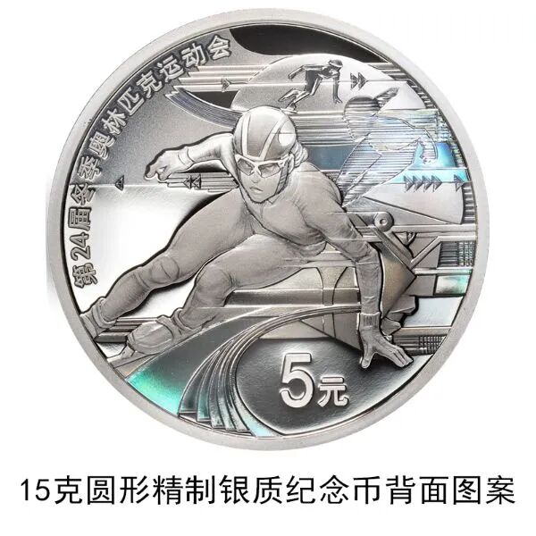 15克圆形银质纪念币背面图案为短道速滑运动造型等装饰组合设计,并刊“第24届冬季奥林匹克运动会”字样及面额。