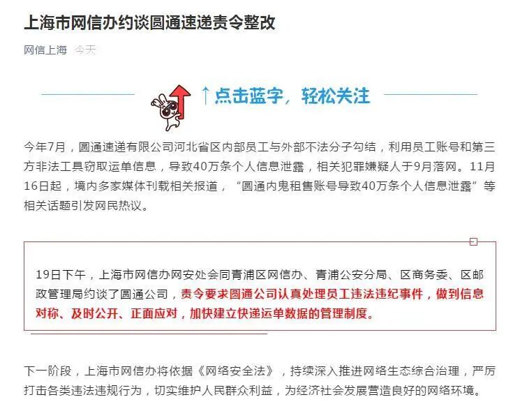 11月19日下午,上海市网信办网安处会同青浦区网信办、青浦公安分局、区商务委、区邮政管理局约谈了圆通公司,责令要求圆通公司认真处理员工违法违纪事件,做到信息对称、及时公开、正面应对,加快建立快递运单数据的管理制度。