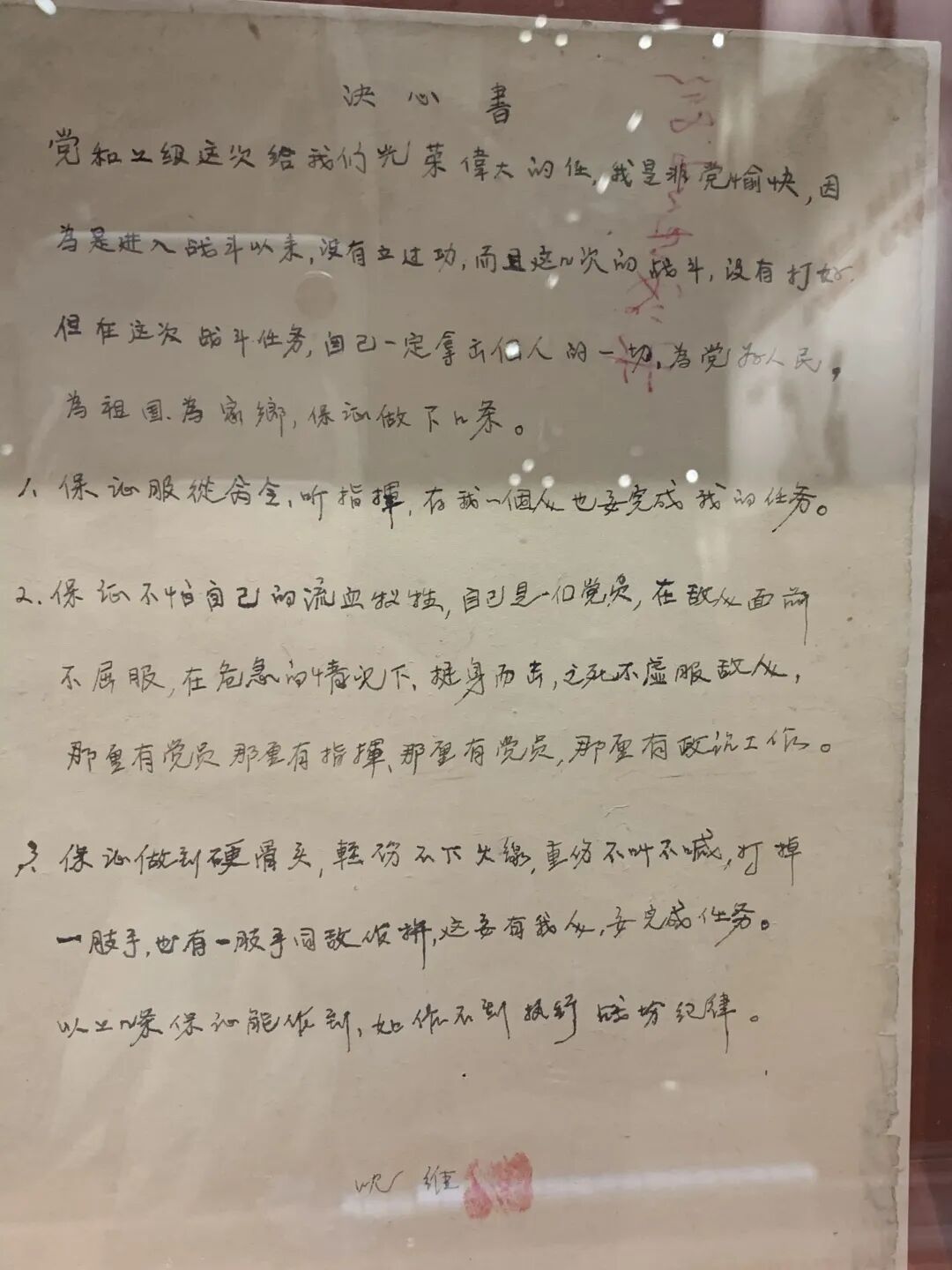 △志愿军战士沈维《决心书》写道:“保证做到硬骨头,轻伤不下火线,重伤不叫不喊,打掉一只手,也有一只手同敌拼,只要有我在,就完成任务……”