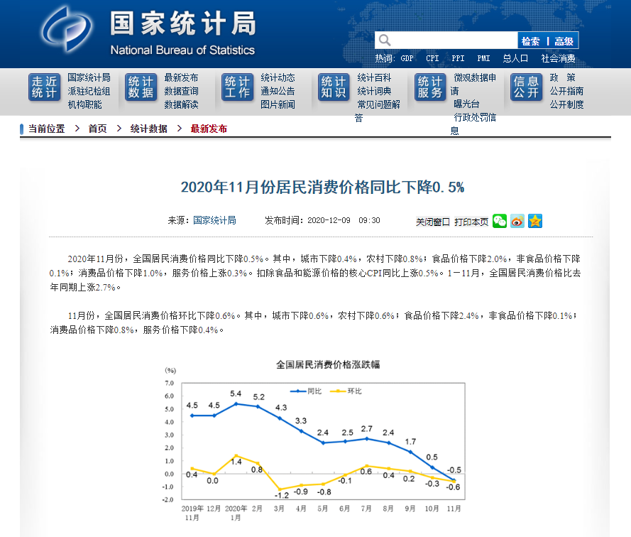2020年11月份,全国居民消费价格同比下降0.5%。其中,城市下降0.4%,农村下降0.8%;食品价格下降2.0%,非食品价格下降0.1%;消费品价格下降1.0%,服务价格上涨0.3%。扣除食品和能源价格的核心CPI同比上涨0.5%。1—11月,全国居民消费价格比去年同期上涨2.7%。