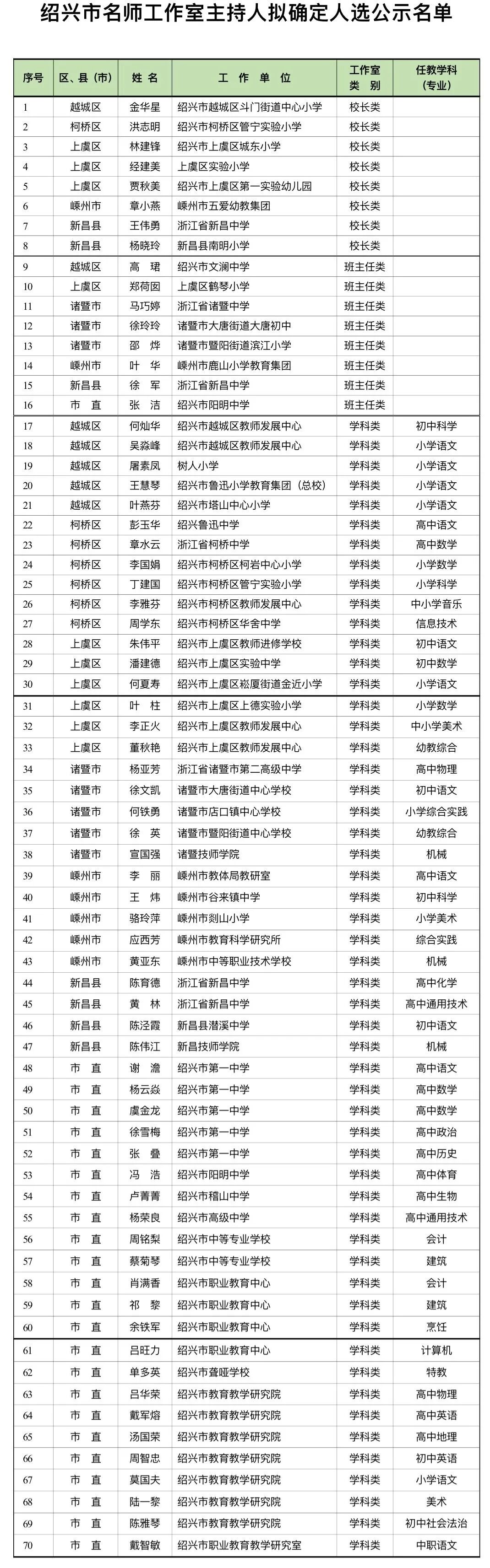 根据《绍兴市教育局关于印发<绍兴市名师工作室管理办法>的通知》(绍市教政〔2020〕64号)文件精神,在个人申报、学校和区、县(市)教体局推荐的基础上,经市级审核,拟确定金华星等70位同志为绍兴市名师工作室主持人人选。现予以公示,公示时间从12月11日起到12月18日止。