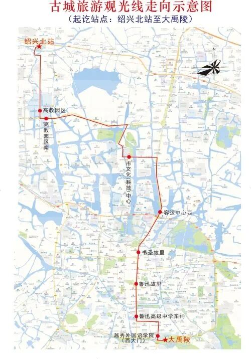 新开行的这条古城旅游观光线名叫大禹号—古城旅游双层巴士观光线(简称:大禹号),线路走向为绍兴北站—站前大道—群贤路—解放大道—适南路—洋江路—中兴大道—中兴路—城南大道—会稽路—大禹路—大禹陵,经停绍兴北站、高教园区、高教园区南、市文化(科技)中心、客运中心西、书圣故里、鲁迅故里、鲁迅高级中学东门、越秀外国语学院(西大门)、大禹陵等站。