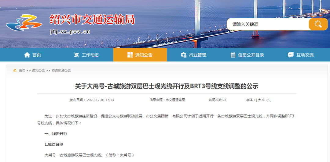 据绍兴市交通运输局消息,为进一步加快古城旅游经济建设,促进公交与旅游联动发展,市公交集团第一有限公司计划于近期开行一条古城旅游双层巴士观光线,并同步调整BRT3号线支线。