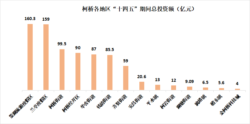 其次是柯桥街道、柯桥经开区、华舍街道、钱清街道以及齐贤街道,在“十四五”期间的重大项目总投资额,皆在 50 亿以上。