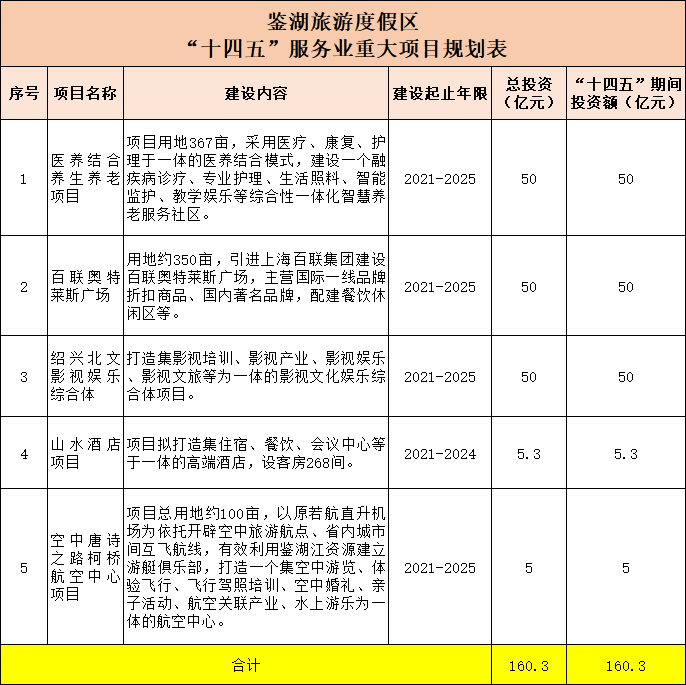 鉴湖旅游度假区共有5个项目,分别是:医养结合养生养老项目、百联奥特莱斯广场、绍兴北文影视娱乐综合体、山水酒店以及空中唐诗之路柯桥航空中心,总投资160.3亿元,“十四五”期间的总投资额为160.3亿元。