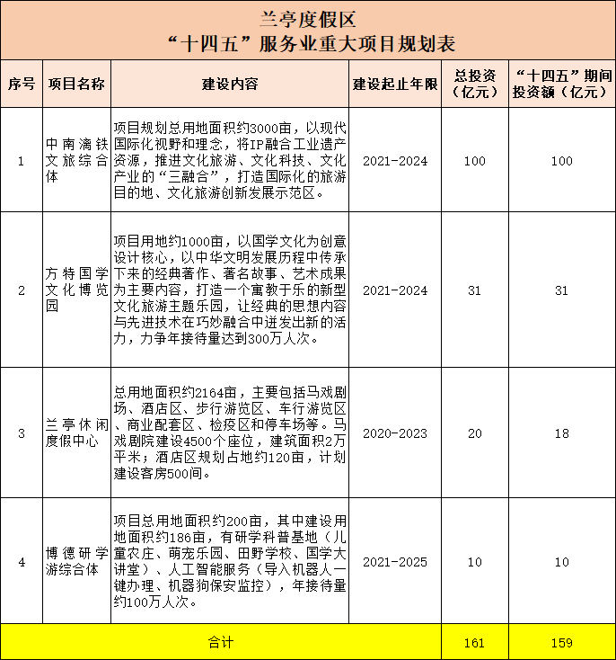 兰亭度假区共有4个项目,分别是:中南漓铁文旅综合体、方特国学文化博览园、兰亭休闲度假中心、博德研学游综合体,总投资161亿元,“十四五”期间的总投资额为159亿元。