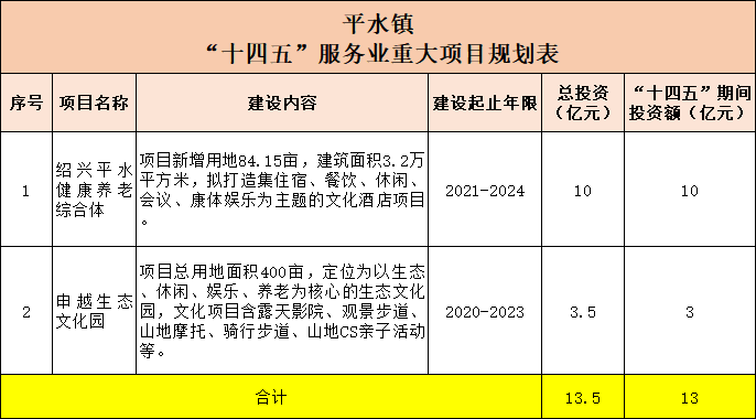 平水镇有2个项目,分别是:绍兴平水健康养老综合体、申越生态文化园项目,总投资13.5亿元,“十四五”期间的总投资额为13亿元。