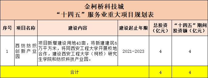 金柯桥科技城有1个项目——西纺纺织创新产业园,总投资4亿元,“十四五”期间的总投资额为4亿元。