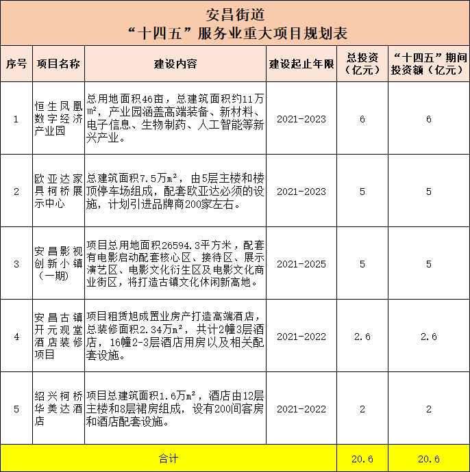 安昌街道有5个项目,分别是:恒生凤凰数字经济产业园、欧亚达家具柯桥展示中心、安昌影视创新小镇(一期)、安昌古镇开元观堂酒店装修项目以及绍兴柯桥华美达酒店,总投资20.6亿元,“十四五”期间的总投资额为20.6亿元。
