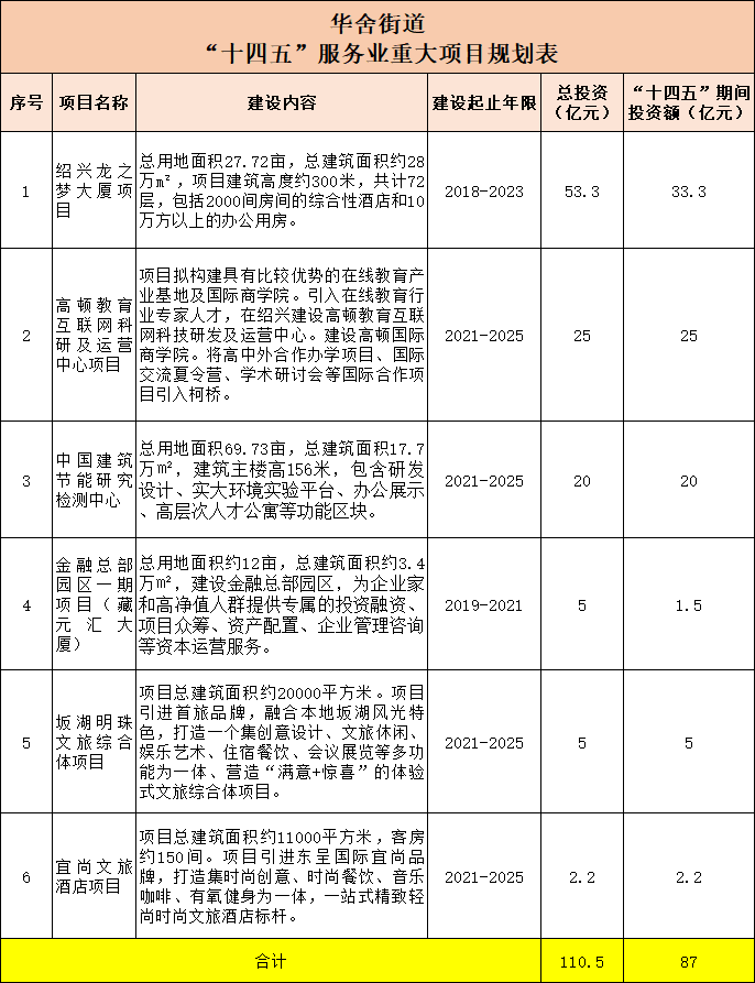 华舍街道有6个项目,分别是:绍兴龙之梦大厦、高顿教育互联网科研及运营中心、中国建筑节能研究检测中心、金融总部园区一期(藏元汇大厦)、坂湖明珠文旅综合体以及宜尚文旅酒店,总投资110.5亿元,“十四五”期间的总投资额为87亿元。