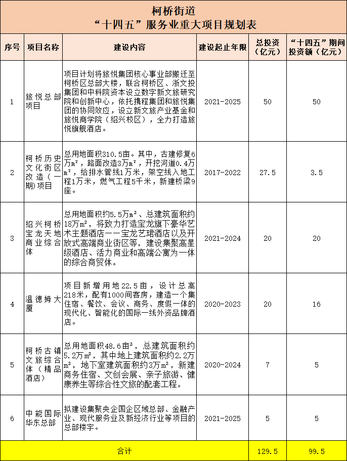 柯桥街道共有6个项目,分别是:旅悦总部项目、柯桥历史文化街区改造(一期)项目、绍兴柯桥宝龙天地商业综合体、温德姆大厦、柯桥古镇文旅综合体(精品酒店)和中能国际华东总部,总投资129.5亿元,“十四五”期间的总投资额为99.5亿元。