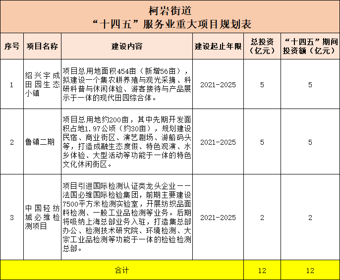柯岩街道有3个项目,分别是:绍兴宇成田园生态小镇、鲁镇二期以及中国轻纺城必维检测,总投资12亿元,“十四五”期间的总投资额为12亿元。