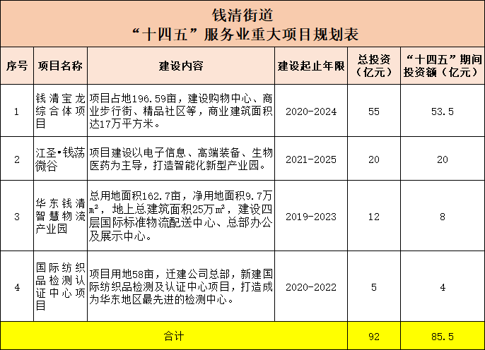 钱清街道有4个项目,分别是:钱清宝龙综合体、江圣·钱荡微谷、华东钱清智慧物流产业园以及国际纺织品检测认证中心,总投资92亿元,“十四五”期间的总投资额为85.5亿元。