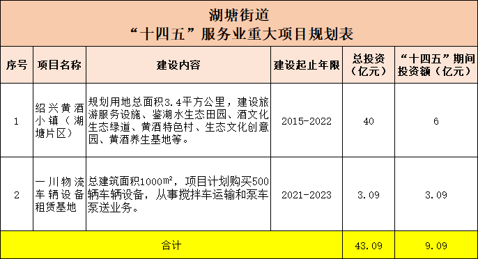 湖塘街道有2个项目,分别是:绍兴黄酒小镇(湖塘片区)、一川物流车辆设备租赁基地,总投资43.09亿元,“十四五”期间的总投资额为9.09亿元。