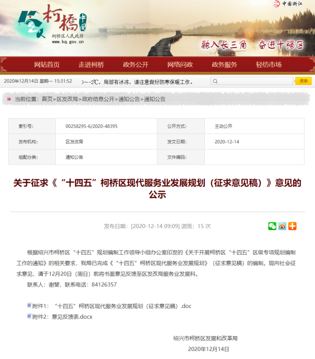 近日, 绍兴市柯桥区人民政府网站发布《关于征求《“十四五”柯桥区现代服务业发展规划(征求意见稿)》意见的公示》。