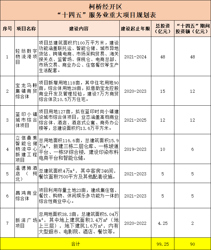 柯桥开发区共有7个项目,分别是:轻纺数字物流港、宝龙马鞍集镇商贸综合体、蓝印小镇城市综合体、立信鼎乘智能仓储物流中心新建工程、温德姆酒店(柯北)、昌鸿商业综合体以及新滨广场,总投资99.25亿元,“十四五”期间的总投资额为90亿元。
