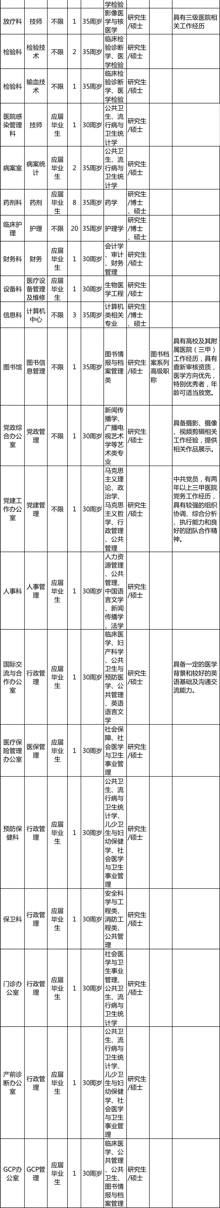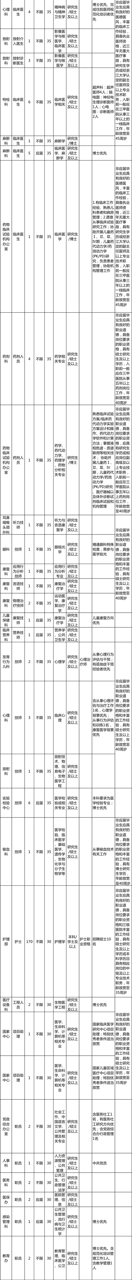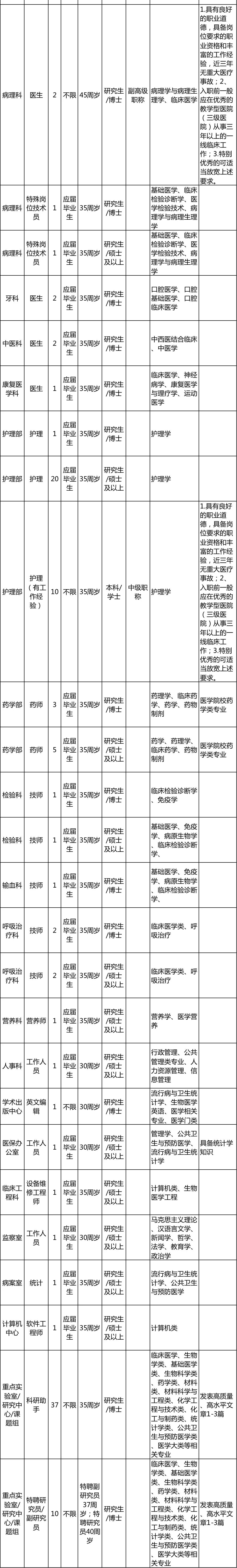 公开招聘98个岗位596人,其中:医疗岗438人,医技岗10人,药剂岗3人,科研岗52人,护理岗35人,非医疗技术岗4人,实验技术岗1人,管理岗3人。