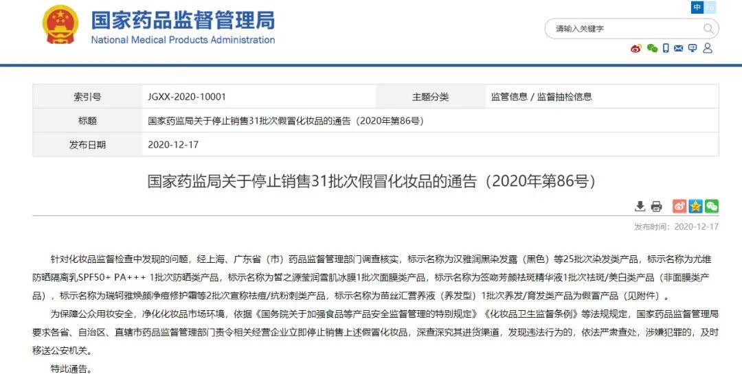 据国家药监局网站消息,近日,国家药监局发布关于停止销售31批次假冒化妆品的通告(2020年第86号)。