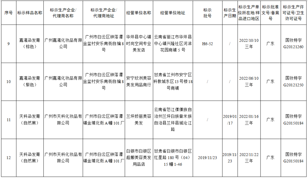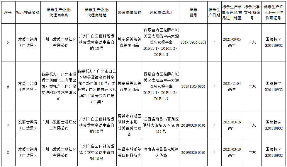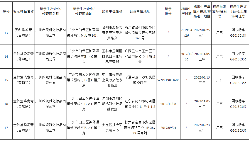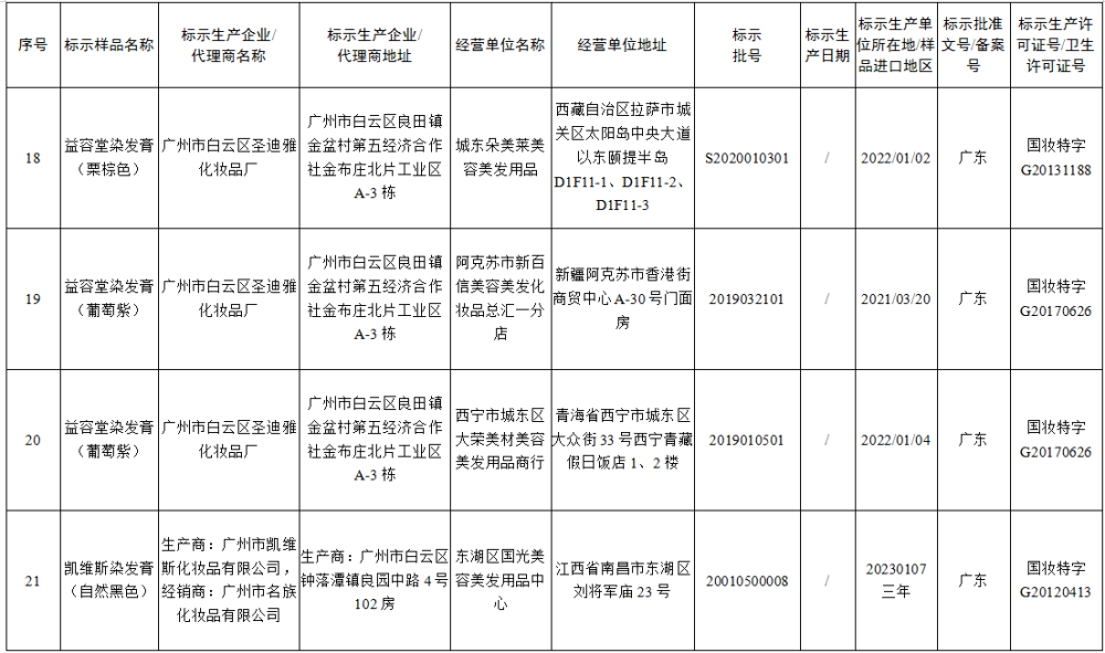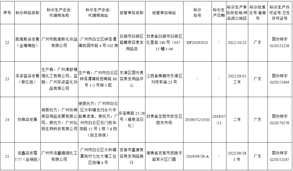 标示名称为汉雅润黑染发露(黑色)等25批次染发类产品,