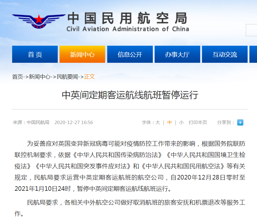 为妥善应对英国变异新冠病毒可能对疫情防控工作带来的影响,根据国务院联防联控机制要求,依据《中华人民共和国传染病防治法》《中华人民共和国国境卫生检疫法》《中华人民共和国突发事件应对法》和《中华人民共和国民用航空法》等有关规定,民航局要求运营中英定期客运航班的航空公司,自2020年12月28日零时至2021年1月10日24时,暂停中英间定期客运航线航班运行。
