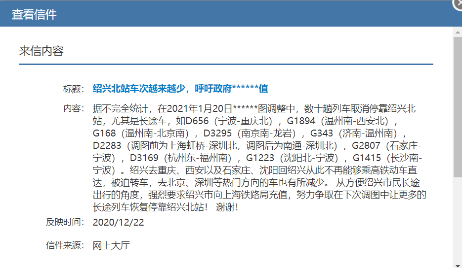 该网友表示,据不完全统计,在2021年1月20日******图调整中,数十趟列车取消停靠绍兴北站,尤其是长途车,如D656(宁波-重庆北),G1894(温州南-西安北),G168(温州南-北京南),D3295(南京南-龙岩),G343(济南-温州南),D2283(调图前为上海虹桥-深圳北,调图后为南通-深圳北),G2807(石家庄-宁波),D3169(杭州东-福州南),G1223(沈阳北-宁波),G1415(长沙南-宁波)。绍兴去重庆、西安以及石家庄、沈阳回绍兴从此不再能够乘高铁动车直达,去北京、深圳等热门方向的车也有所减少。