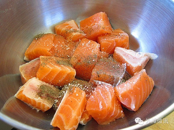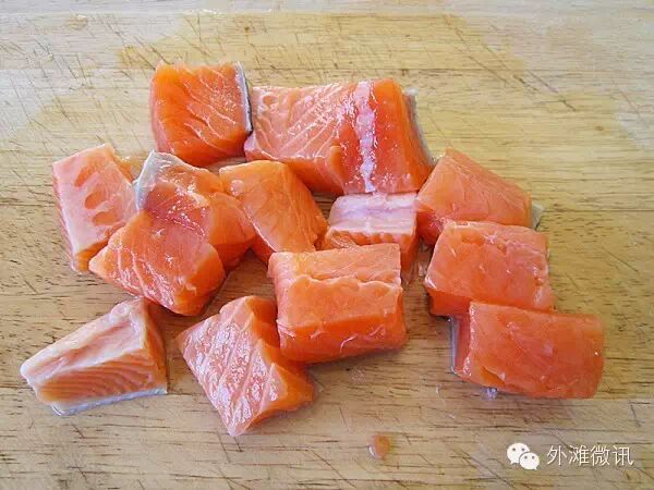 1.三文鱼连皮一起切成粒。