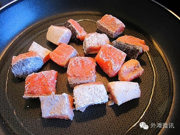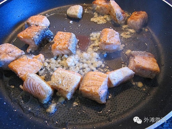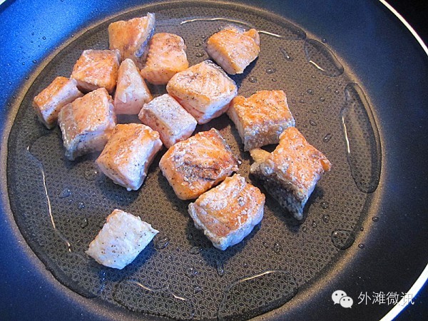 4.烧热锅倒入适量橄榄油,将腌好的三文鱼粒放入大火煎。