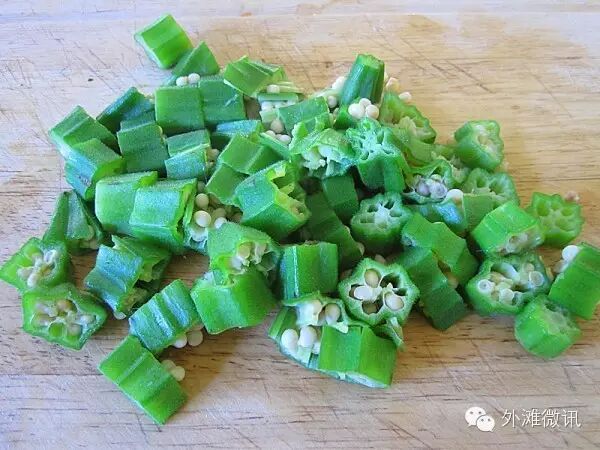 3.秋葵用微波炉叮好之后切成粒。