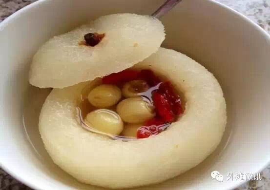 这是一种传统的食疗补品,先把梨从蒂下三分之一处切下当盖,挖去梨心,掏空梨中间果肉、并切块;再把川贝母细粉(3克左右配1个梨)及适量冰糖放入梨中,再把梨放在蒸锅里,大火蒸45分钟左右,取出后即可食用。这种吃法不仅润肺,还有止咳化痰之功效。周围亲朋如果有嗓子不舒服的话,尽可以放心食用。也可根据口味、功效的不同,添加枸杞、莲子、银耳、山药等食材。