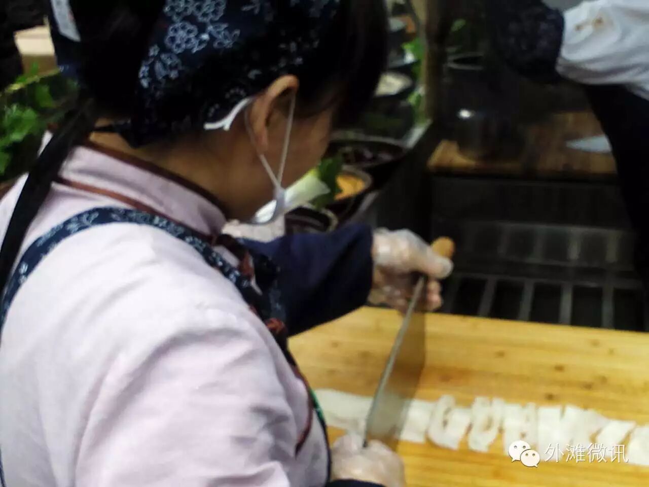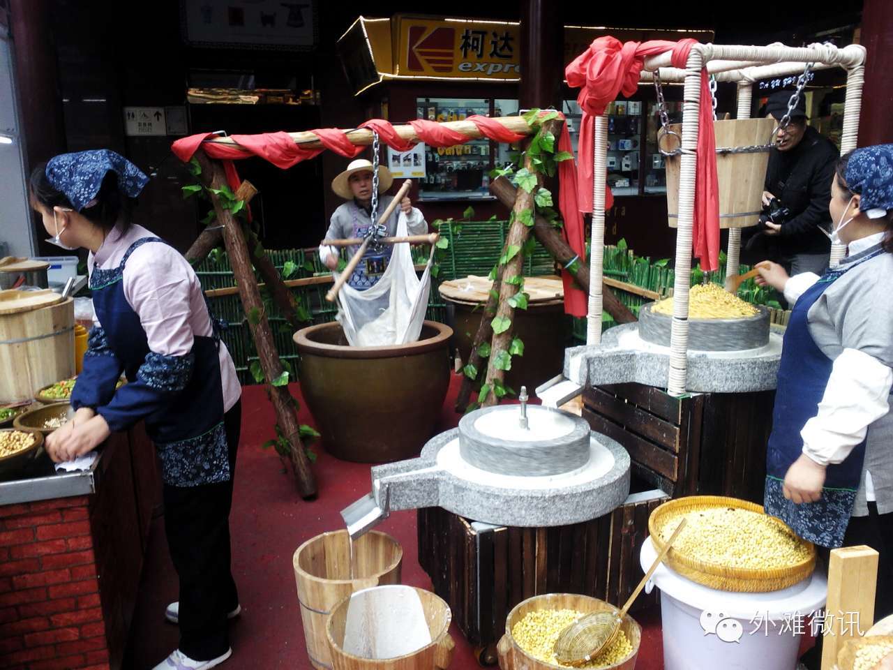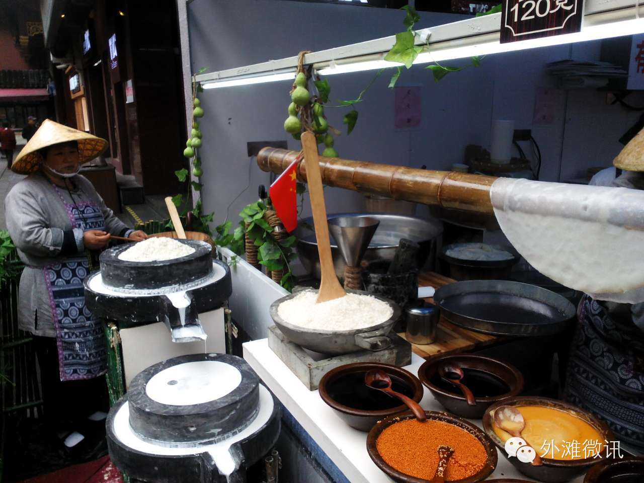 现场有趣的工艺还真不少,石磨匀速运转精心碾压而成的农家豆腐,质地细腻、软硬适度;竹淘箩浸在水缸里,用手将面团慢慢漂洗汰出的面筋,在以鸡汤慢“笃”,便成了一道鲜嫩柔润的鸡笃面筋;将磨制的米面浆蒸熟后切条,再加入各色调味,便端上一碗晶莹洁白、香气诱人的刀切香米皮。各色美食技艺令人应接不暇,也只有在现场才能一窥究竟。