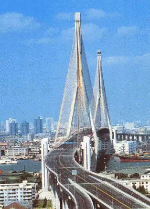 世界第一斜拉桥--杨浦大桥,于1991年4月29日动工,1993年9月15日建成,历时仅2年5个月。大桥全长7658米,其中主桥1172米,中孔跨度602米,两岸桥塔高208米,为倒“Y”钻石型,桥塔两侧各有32对共256根鹅黄色拉索将桥面凌空悬起,索面成立体扇形布置,蔚为壮观。最长的一根拉索由301根直径7毫米的强钢丝编织而成,长328米,重33吨。主桥面宽30.35米,设6车道,两旁各有2米人行道,两岸有电梯上下,供人观光游览。大桥设计车速为每小时60公里,日通行能力5万辆,桥下净空48米,可通行5.5万吨级轮船。