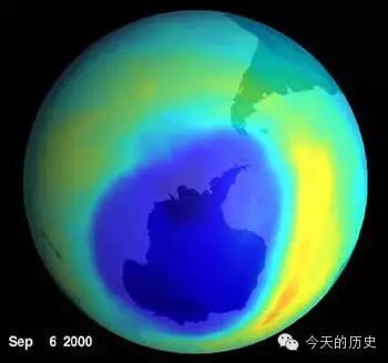 1995年9月16日,是第一个国际保护臭氧层日。联合国大会于1995年1月23日决定每年的9月16日为国际保护臭氧层日,这表明臭氧层问题已被国际社会公认为与酸雨、温室效应并列的全球性环境问题之一。这幅由美国航空航天局提供的图像中,南极上空的臭氧层空洞像一个巨大的蓝色水滴(摄于2000年9月6日)。