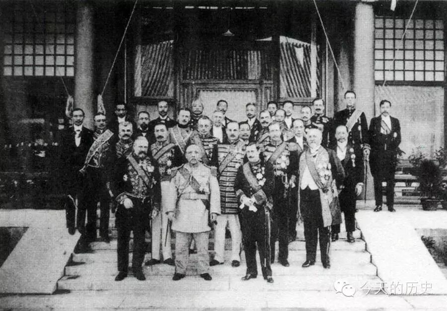为了赶在武昌起义两周年纪念日登上总统宝座,袁世凯胁迫国会于6日仓促进行总统选举。一大早,他派出拱卫军司令李进才率数千军警、流氓、地痞,改穿便服,打着“公民团”的旗号,把国会围得水泄不通,声称“非将公民所属望的总统于今日选出,不许选举人出会议场一步。”袁世凯亲信梁士诒高价收买100余名议员组成的御用公民党更是积极拉票、活动。从早上8时到晚上10时,议员们忍饥挨饿,连续投票3次,终以703票中507票赞成,选出袁世凯为正式大总统。中华民国的第一任大总统在闹剧中登场。图为袁世凯在北京就任正式大总统后与各国使节合影