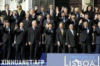 2007年10月19日,欧盟非正式首脑会议在葡萄牙首都里斯本通过了欧盟新条约,即《里斯本条约》,以取代2005年先后遭到法国和荷兰否决的《欧盟宪法条约》,从而实际上结束了欧盟长达6年的制宪进程。根据新条约,欧盟的决策方式和机构设置都将进行大刀阔斧的革新,旨在让扩大后的欧盟更好地运转。图为12月13日,在葡萄牙首都里斯本,欧盟各成员国领导人在《里斯本条约》签署后合影留念。
