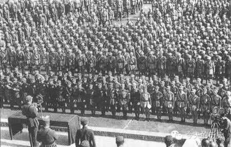 蒋介石鉴于中国驻印军和援缅远征军中下级干部和特种兵严重缺员,盟军大量来华急需翻译,决定发起10万知识青年从军运动。9月,蒋介石在国民参政会上号召知识青年从军。10月又决定成立青年从军指导委员会,指定何应钦、陈果夫、吴铁城、张治中、白祟禧、康泽为常委,在蒋介石直接领导下,推动知识青年从军工作。同时各省市和各大学也分别成立委员会,具体由各级三青团负责,中央由二青团组织处长康泽主持征集工作。图为1944年10月21日,蒋介石在知识青年从军大会上,举起拳头,激动地发出了令青年热血沸腾的口号:“一寸山河一寸血,十万青年十万军!”