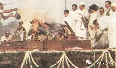 1984年10月31日,印度总理英迪拉·甘地遇刺身亡。印度政府武装镇压锡克教极端分子是英·甘地被杀害的直接原因。图为甘地一家人(右)在传统的火葬柴堆前向死者遗体告别