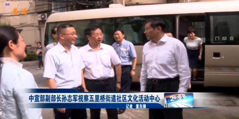 中宣部副部长孙志军在市委宣传部副部长朱芝松、区委常委宣传部长李崟等的陪同下来五里桥街道社区文化活动中心,视察该中心的具体运作情况。