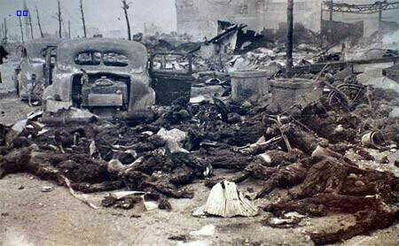 1945年3月9日,美国空军开始对日本98座城市实行战略轰炸,334架B一29从关岛直扑东京,实行轮番扫地式的轰炸,投下2000余吨燃烧弹,市中心41平方公里被夷为平地,26.7万幢建筑物付之一炬,共炸死烧死83793人(实际死亡可能超过9万人),超过1923年9月1日东京大地震的死亡数(7.3万人);另有10万人被烧成重伤,100万人无家可归。