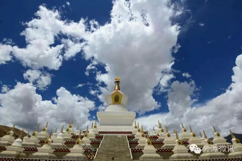 云上漫游,巍峨洁净的白塔在白云映衬下犹为壮观,4层108个小白塔众星拱月般环绕在中央大白塔周围。情不自禁转动塔基座下的一排排转经桶,虔诚膜拜,昼夜不息。