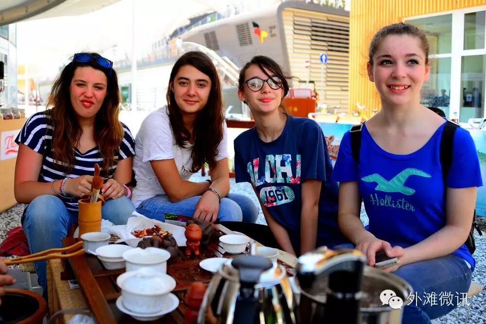 中国馆多少还有点拘谨,自己不敢妄为,委托了企业联合馆在场外弄了一个临时卡座,供游客喝茶休闲。一打听,东家竟然来自天津的一家茶商。几名懵懵懂懂的美少女,品茗之后带着狗不理的味道直冲镜头傻笑……进了世博,几乎没有不傻笑的姑娘!